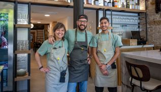 Víctor Piñero, cocinero y copropietario, con dos de los trabajadores de El Ángelus.