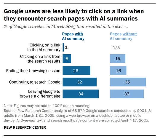 La ceremonia de entrega ha sido también el espacio para homenajear a Laura Zommer, Patrícia Campos Mello y al medio venezolano Armando.info, ganadores del Reconocimiento a la Excelencia del Premio Gabo 2025, por su compromiso con el periodismo riguroso, valiente e independiente en la región. Toda la información y el detalle de los trabajos ganadores, en el siguiente enlace: ➭ Los usuarios de Google hacen menos clics en enlaces cuando reciben respuestas de IAUn estudio realizado por el Pew Research Center, publicado esta semana, revela que los usuarios de Google que se reciben una respuesta generada con inteligencia artificial (AI Overviews) tras su consulta realizan menos clics en los enlaces que ofrece Google hacia otros sitios web que los usuarios que no ven un resumen de IA. En concreto, en las páginas sin resumen de IA, el 15% de los usuarios hace clic en un enlace ofrecido por Google, mientras que el porcentaje cae al 8% en los casos en los que Google ofrece un resumen de IA. Además, también aumentan las probabilidades de que el usuario abandone la sesión de navegación tras ver el resumen de IA. Así, un 26% de los usuarios termina su navegación si recibe como respuesta un resumen de IA, mientras que los que abandonar al recibir resultados tradicionales suponen el 15%. Google lanzó “AI Overviews” el pasado año en Estados Unidos, y en fecha más reciente ha ido ampliando a muchos otros mercados esta opción. “AI Overviews” ofrece una respuesta generada por IA a la consulta del usuario. Editores de medios de todo el mundo están alertando que esto está provocando una caída del tráfico procedente de Google a sus sitios web. Más información: