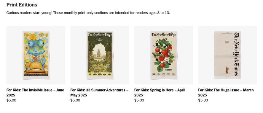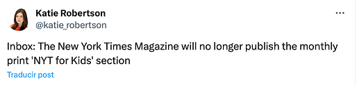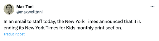 ➭ El NYT dejará de publicar la edición impresa mensual de The New York Times for KidsThe New York Times dejará de publicar su suplemento mensual infantil impreso The New York Times for Kids. Lo ha comentado en X el periodista de Semafor Max Tani: También lo ha comentado en X la reportera de medios del propio NYT, Katie Robertson: De momento no se han ofrecido más detalles sobre el cierre de este suplemento. En la tienda online del diario (NYT Store) se pueden adquirir ejemplares anteriores: Este domingo se publica el número de julio de The New York Times for Kids, que podría por tanto ser el último en papel. El suplemento se publicaba desde el año 2017. ➭ The Athletic impulsará el periodismo visual e interactivoEl editor de la sección The Upshot de The New York Times, Kevin Quealy, ha sido nombrado director editorial de Visuals & Data de The Athletic para liderar una importante expansión del periodismo visual, de datos e interactivo que ofrece el medio deportivo propiedad del Times. Kevin Quealy formaba parte del equipo de The Upshot desde su creación, en el año 2014, y en los últimos tres años ha sido su editor.