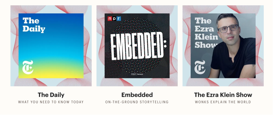 Entre el centenar de podcasts de la lista se incluyen títulos como “The Daily”, “In the Dark”, “Homecoming”, “Dirty John”, “Fresh Air”, “You Didn’t See Nothin” o “The Bill Simmons Podcast”, por citar a algunos. Para cada podcast escogido se ofrece una descripción y el enlace para escucharlo. Por ejemplo, estos son los seis podcasts seleccionados en la categoría de News & Politics: