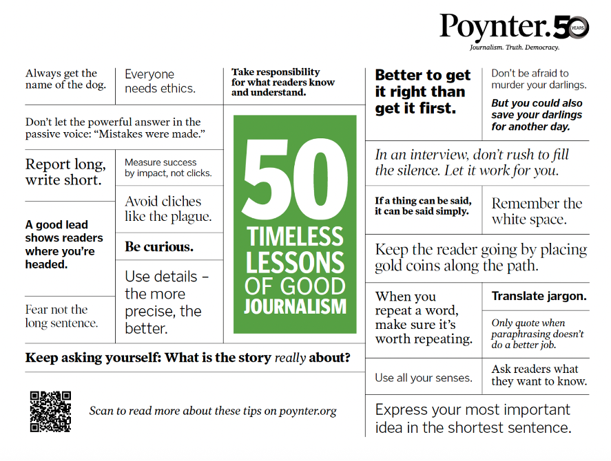 ¿Cuánto cuesta Manus? Manus funciona con un sistema de créditos que los usuarios consumen al ejecutar tareas. Cada acción resta créditos según su complejidad y duración. Los nuevos usuarios reciben 1.000 créditos iniciales y 300 créditos diarios gratuitos, lo que permite probar la herramienta sin pagar. Pero también se puede ampliar con tres planes de suscripción: • Basic: 1.900 créditos/mes por 16 USD • Plus: 3.900 créditos/mes por 33 USD • Pro: 19.900 créditos/mes por 166 USD, con hasta 5 tareas simultáneas y prioridad en los servidores Los créditos también se pueden ampliar con paquetes extra para suscriptores. ¿Qué viene ahora? Se espera que estos agentes pasen de generar webs a crear aplicaciones web completas, con backend, lógica, autenticación y más. La gran evolución será cuando estos agentes sean realmente colaborativos: uno diseña, otro escribe, otro valida el código, y todos dialogan entre sí, como un equipo humano. En resumen Los agentes como Manus o MiniMax son la punta de lanza de la automatización creativa. No solo ejecutan tareas, sino que toman decisiones, se coordinan y producen resultados en tiempo récord. Si en 2022 nos sorprendían los generadores de texto, en 2025 nos impresiona ver cómo una IA monta tu negocio digital mientras tomas un café. Paréntesis MEDia es un portal y newsletter especializado en IA, inmersividad e industria audiovisual con el que Tendenci@s tiene un acuerdo de colaboración para la elaboración de este Espacio IA. Suscríbete aquí. ➭ Las 50 lecciones de buen periodismo de PoynterThe Poynter Institute, que está celebrando este año su 50 aniversario, ha actualizado y ampliado su lista de consejos y lecciones de buen periodismo publicada hace 10 años para sumarle 10 nuevos conceptos y dejarla en 50. Se trata de un gran material al que podemos recurrir en cualquier momento para recordar elementos esenciales de nuestra profesión o buscar inspiración e ideas para mejorar nuestro trabajo. Así lo presentan: