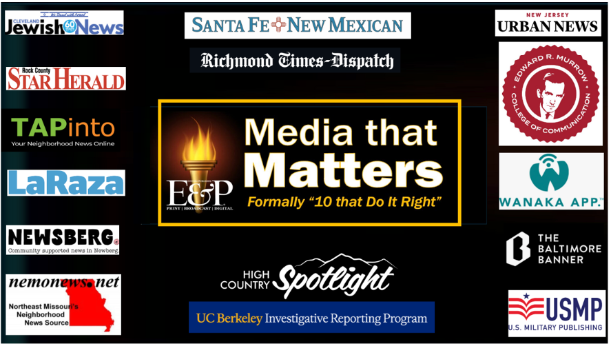 ➭ E&P premia a 15 medios que han sabido conectar con sus comunidadesLa revista estadounidense E&P premia cada año a medios de todo tipo y tamaño por la realización de proyectos que les hayan permitido conectar de manera exitosa con sus respectivas audiencias. Hasta el pasado año esta distinción se denominaba “10 That Do It Right”. Este año, ha cambiado a “Media That Matters”. E&P ha publicado el listado de los 15 proyectos seleccionados, que describe de manera detallada. La lista incluye una gran variedad de proyectos que tienen en común su capacidad de conectar con la audiencia y de fomentar el engagement. Así, hay proyectos de tecnología, investigaciones periodísticas, eventos, newsletters, podcasts, colaboraciones o técnicas de engagement con la audiencia. Además, a todos los medios se les pregunta qué consejos ofrecerían a otros medios que quieran aumentar su relevancia e impacto entre las comunidades a las que dan servicio. Los medios premiados este año son los siguientes (un par de medios no están disponibles para ser consultados desde Europa por motivos legales):