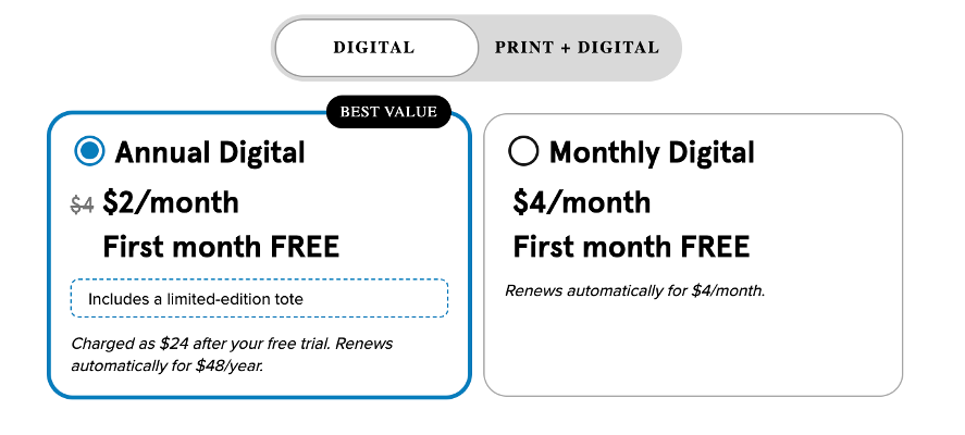 La suscripción anual digital tiene un coste en promoción de 24 dólares el primer año, y luego pasa a 48 dólares. La mensual cuesta 4 dólares al mes. La suscripción print+digital cuesta 36 dólares el primer año (precio promocional), para pasar luego a 60 dólares al año. La directora editorial global de WIRED, Katie Drummond, ha explicado la nueva propuesta dirigida a los suscriptores de pago y ha detallado las razones que la han inspirado. Drummond define al inicio de su artículo cuál es la apuesta periodística que quiere hacer WIRED: