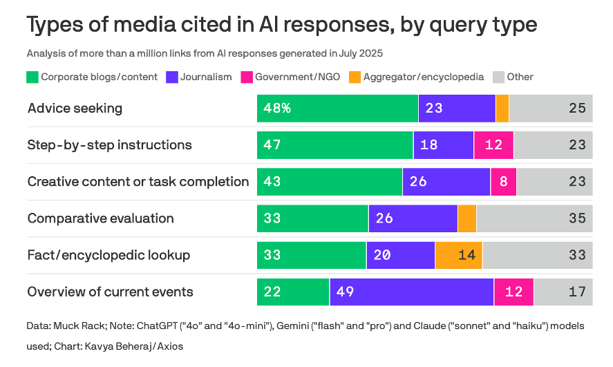 Axios ha elaborado un gráfico en el que resume qué categoría de fuente es más citada según el tipo de consulta (el estudio establece seis tipos de consulta: búsqueda de consejo/opinión, actualidad, evaluación comparativa, consulta enciclopédica o de hechos, instrucciones paso a paso y contenido creativo o cumplimiento de tareas: Más información: