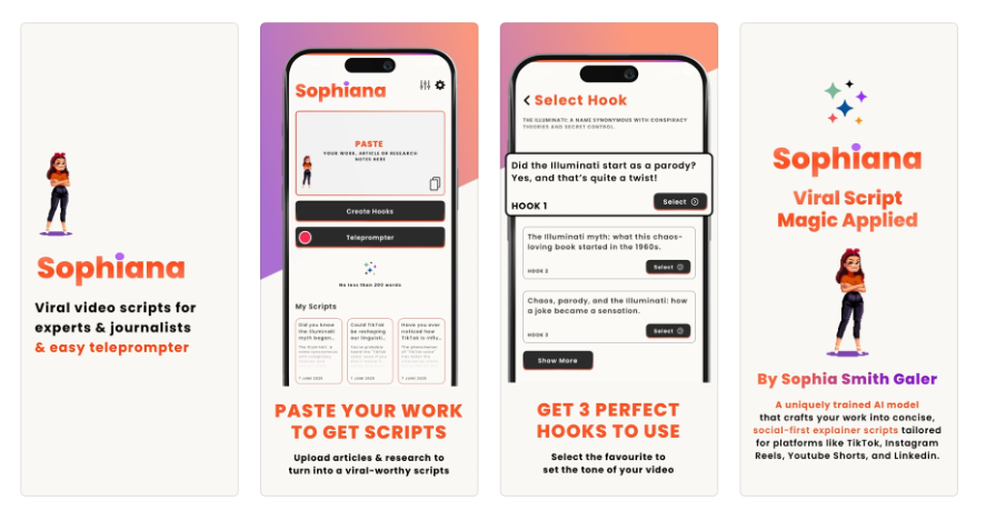 Recientemente, Smith Galer ha creado y lanzado una app llamada Sophiana, disponible en la App Store, que convierte cualquier artículo, guion de documental o notas de una investigación, con la ayuda de la IA, en un guion pensado especialmente para plataformas como Instagram o TikTok, y que incluye una función de teleprompter para facilitar la grabación desde el móvil. Así lo explica ella misma en el artículo: