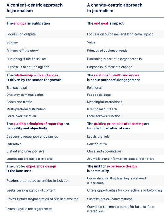 Newsrooms spend too much time focusing on producing “content” and figuring out ways to distribute it on various platforms. Meanwhile, multiple studies show audiences find the news they receive to be irrelevant to the problems they face in their daily lives. News avoidance is a growing trend. (See also Reuters’ own study of changing audience preferences.) More focus on creating changeAcuña proposes that newsrooms focus on Change-Centric Journalism. It pursues “impact that improves the lives of people through care-based reporting and purposeful engagement with them.” And Acuña’s talent for creating eloquent visuals is evident in this graphic, which also can be viewed at this link: A comparative analysis of two models of journalismThe long game: changeAcuña’s model advocates playing the long game. It involves a news organization getting engaged with the community, not just reporting on it. (Jesse Hardman’s the Listening Post Collective in the U.S., which I profiled here, follows a similar model.) If a news organization finds injustice, corruption, or cruelty in community’s institutions, it must not let up. Editors and reporters sometimes get bored with covering a topic, but the mission of public service does not allow us to get bored with injustice or corruption. Digital audiences, someone said, are “Lazy, Selfish, and Ruthless.” The tech platforms’ algorithms demand something new to create anxiety, fear, hatred, and titilation, page views, and advertising revenue. I would agree with Acuña’s observation that the best newsrooms have “a deep commitment to and active involvement in seeing individuals, communities, and societies thrive.” Previously: Invite your friends and earn rewardsIf you enjoy Your News Biz, share it with your friends and earn rewards when they subscribe.  |
