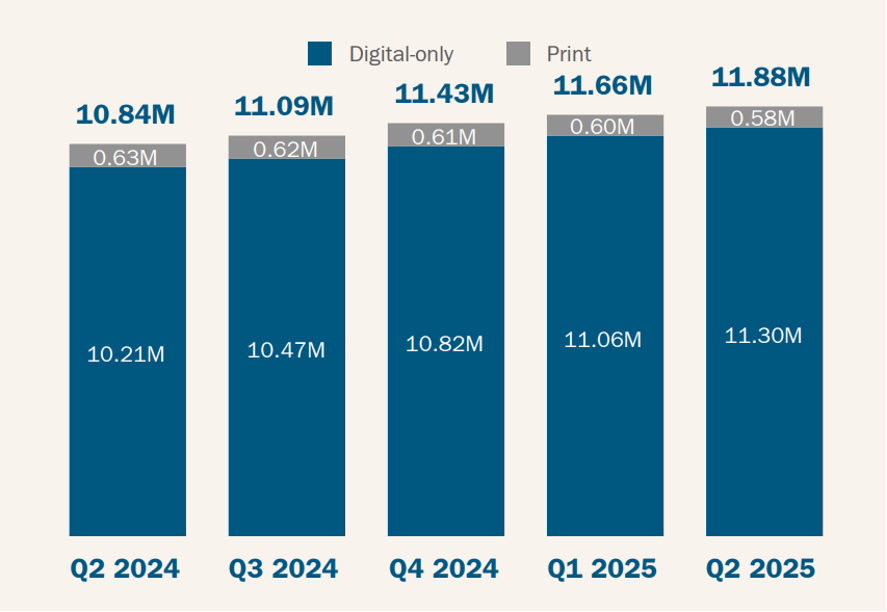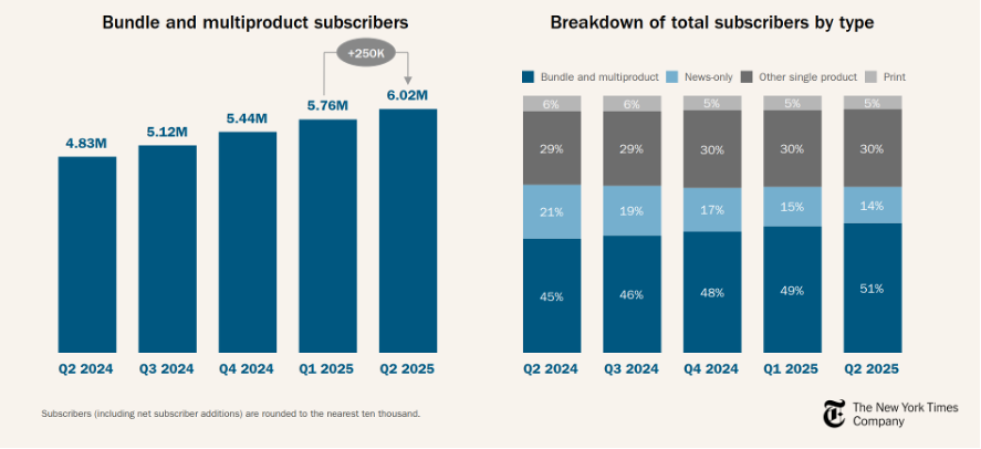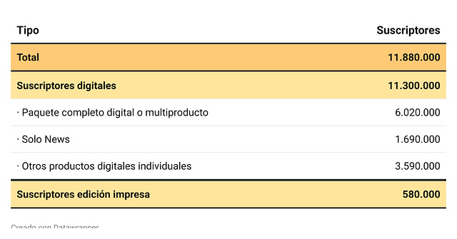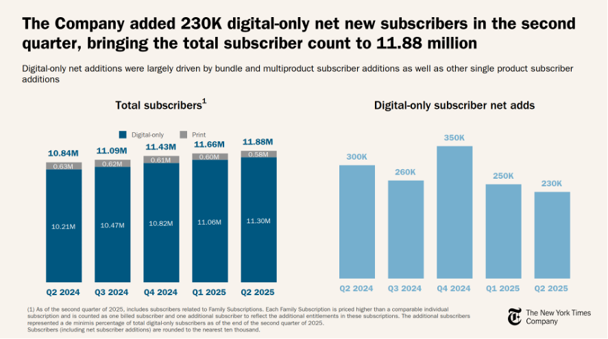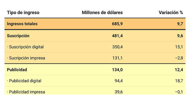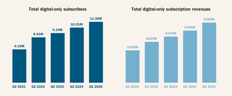 'The New York Times' aumenta sus ingresos casi un 10% y se acerca a los 12 millones de suscriptoresEdición especial de Tendenci@s sobre los resultados de The New York Times del segundo trimestre de 2025¡Hola! Os doy la bienvenida a esta edición especial de Tendenci@s, dedicada a los resultados económicos de The New York Times correspondientes al segundo trimestre de este año, presentados hace unas horas. ➭ The New York Times aumenta sus ingresos casi un 10% y se acerca a los 12 millones de suscriptoresEl diario The New York Times sumó 230.000 nuevos suscriptores digitales durante el segundo trimestre de este año, lo que sitúa a este periódico con un total de 11,88 millones de suscriptores. El diario The New York Times contaba a finales del segundo trimestre de 2025 con un total de 11,88 millones de suscriptores tras ganar 230.000 nuevos suscriptores digitales durante los meses de abril, mayo y junio, según anunció este miércoles la compañía editora, The New York Times Company. La mayor parte de estos suscriptores, 11,3 millones, son digitales. La oferta digital del NYT incluye el producto informativo (News) y cuatro productos especializados: Cooking (recetas de cocina), Games (juegos), Wirecutter (análisis y recomendación de productos) y el sitio de información deportiva The Athletic. Por lo que respecta al producto impreso del diario, terminó el mes de junio de 2025 con 580.000 suscriptores, 20.000 menos que los que tenía en el trimestre anterior y 50.000 menos que hace un año. En el último año, el NYT ha ganado algo más de un millón de suscriptores digitales: en concreto, 1.080.000 nuevos suscriptores digitales. El NYT mantiene la meta de alcanzar los 15 millones de suscriptores totales a finales del año 2027. Casi un 10% más de ingresos El aumento del número de suscriptores digitales del Times y la mejora de la publicidad digital han propiciado un aumento del 9,7% sus ingresos durante el segundo trimestre de 2025 en comparación con el mismo periodo del año anterior. La cifra de ingresos trimestrales ha ascendido a 685,9 millones de dólares. Así se han repartido estos ingresos: En el caso de la publicidad digital, el destacable incremento del 18,7% se ha debido a la fuerte demanda de publicidad en áreas como los juegos y los deportes. En la categoría Otros se incluyen los ingresos por afiliación de Wirecutter, que han seguido aumentando, y las licencias de contenidos. En los primeros seis meses del año 2025, estos han sido los ingresos del NYT: