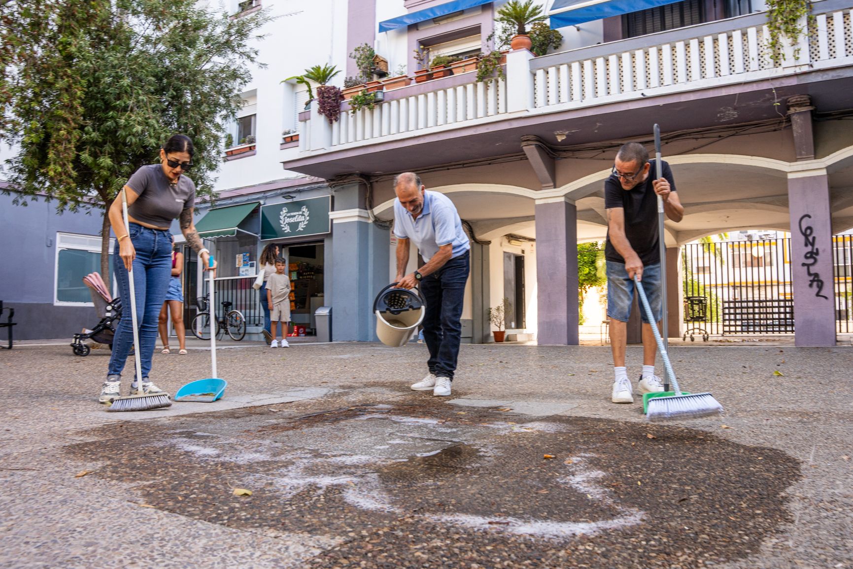 Comerciantes y residentes del patio de La Milagrosa o el entorno de Miramar, en San Severiano, realizan varias salidas semanales incluso con mayores y niños para adecentar su vecindario