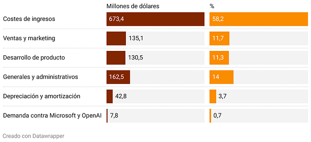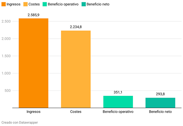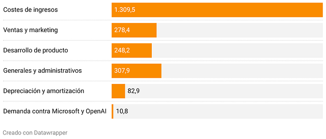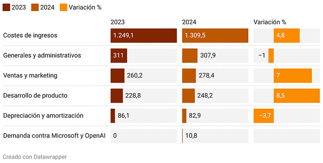 Número de empleados The New York Times Company, compañía editora del diario The New York Times, publica también el medio deportivo The Athletic, la web de recetas Cooking, la web de análisis y recomendación de productos Wirecutter y los juegos de Games. Para tener una idea más exacta de la magnitud de su negocio, a finales de diciembre de 2024, The New York Times Company contaba con 5.900 empleados a tiempo completo. De ellos, 2.800 profesionales estaban implicados directamente en las operaciones periodísticas. Las grandes cifras del negocio del NYT En 2024, el último ejercicio completo presentado por The New York Times, los ingresos totales ascendieron a 2.585,9 millones de dólares, gracias fundamentalmente a los ingresos por suscripciones, mientras que los costes totales fueron de 2.234,8 millones de dólares. Esto supuso un beneficio operativo de 351,1 millones de dólares que se acabó traduciendo en un beneficio neto de 293,8 millones de dólares. Las cifras de The New York Times en 2024 El gráfico muestra los ingresos y costes totales de The New York Times en 2024, además del beneficio operativo y el beneficio neto. Cifras en millones de dólares. Evolución de los gastos entre 2023 y 2024 Si comparamos los gastos del año 2023 con los de 2024, vemos que las partidas que precisamente aumentaron más porcentualmente fueron las de Desarrollo de producto (+8,5%) y Ventas y marketing (+7%), con los Costes de ingresos (4,8%) a continuación. Costes de The New York Times (2023-2024) El gráfico compara, por categorías, los costes del diario The New York Times en 2023 y 2024 (en millones de dólares) y su variación porcentual (%). Veamos con algo más de detalle los cambios más relevantes en cada categoría de costes: