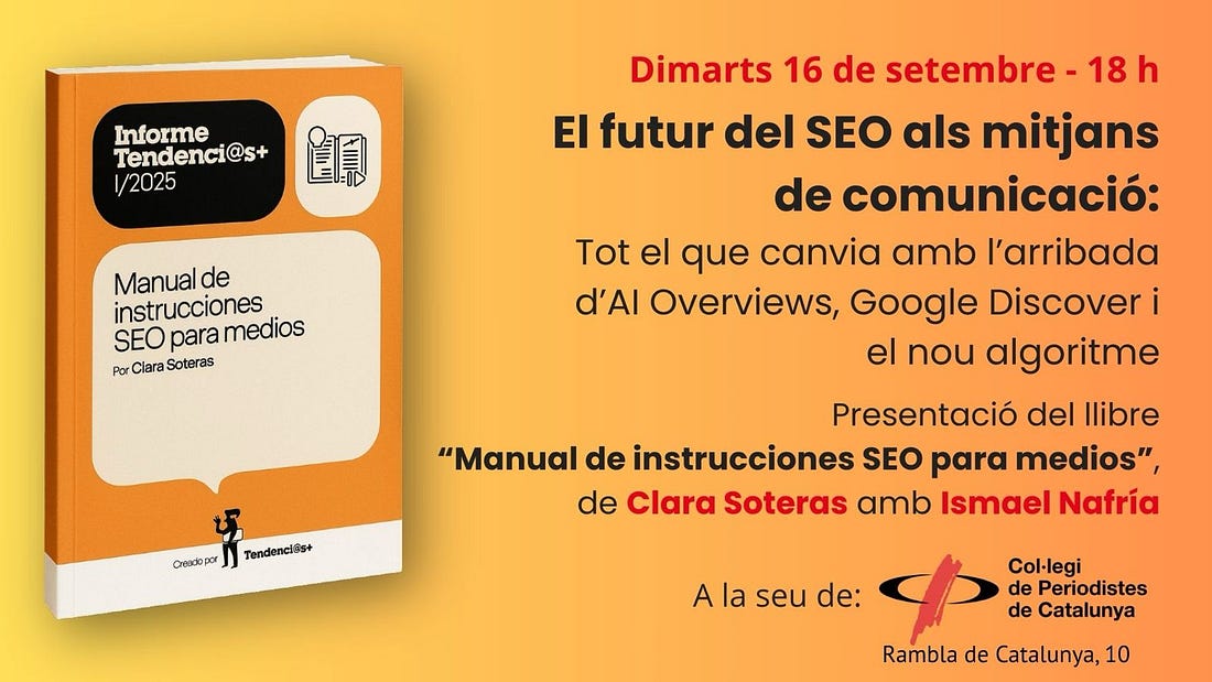 ¿Preparado? ¡Genera la banda sonora de tu libro favorito! ¡Hola! Tras el parón veraniego, te doy la bienvenida al número 134 de la edición quincenal gratuita de Tendenci@s en la que te presento los asuntos relacionados con los medios y el mundo de los contenidos digitales que más me han llamado la atención durante estas últimas semanas y que creo que te pueden resultar más útiles. Esta edición la envío desde Buenos Aires (Argentina), donde estoy unos días por motivos profesionales: la celebración de los 80 años del diario Clarín y la reunión anual de ADEPA, como explico en la parte final de la newsletter. Habrás visto que este número de Tendenci@s cuenta con un nuevo patrocinador, Bokton, a quien agradezco enormemente su apoyo. ¡Te invito a descubrir su original servicio de creación de playlists para cualquier libro! También quiero agradecer a la compañía McKinsey su constante apoyo como Knowledge Partner de la newsletter. McKinsey ofrece una amplia selección de contenidos destacados en español que están disponibles en su web. ➭ Novedades sobre el “Manual de instrucciones SEO para medios”: presentación en Barcelona y próxima versión en inglésCon mucha satisfacción te cuento que a lo largo de las últimas semanas se han seguido vendiendo por diversos países del mundo ejemplares impresos y en PDF del “Manual de instrucciones SEO para medios” de Clara Soteras, el libro que ha inaugurado la colección “Informe Tendenci@s+” de esta newsletter, Tendenci@s. Tenemos un par de novedades a comentar al respecto: